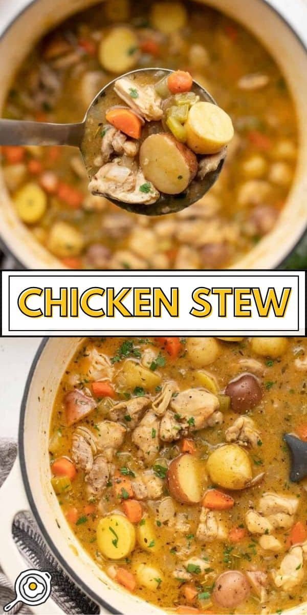 This easy chicken stew is comfort in a bowl—packed full of hearty vegetables floating in a rich, thick gravy-like broth. It’s the perfect meal on a chilly fall or winter day. I used a classic mirepoix mix of onion, carrot, and celery, plus a little garlic, which gives this stew a rich and hearty flavor, tons of color and texture, and the potatoes make the stew even more hearty.