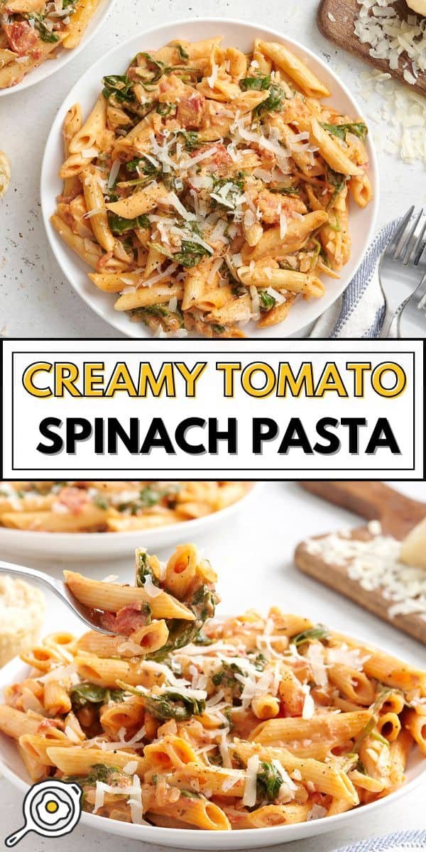 Some days just call for something easy. You know the ones: when the to-do list is never-ending and dinner needs to happen like now. So whenever I’m tired and I’m hungry, quick skillet pasta dishes like this Creamy Tomato and Spinach Pasta are perfect for such an occasion. This easy spinach pasta recipe only requires a few ingredients, cooks up super fast, is perfect for any day of the week, and leaves me feeling full and happy. And judging by the rave reviews, I think it’s safe to say I’m not the only one who keeps this recipe on regular rotation! 😊