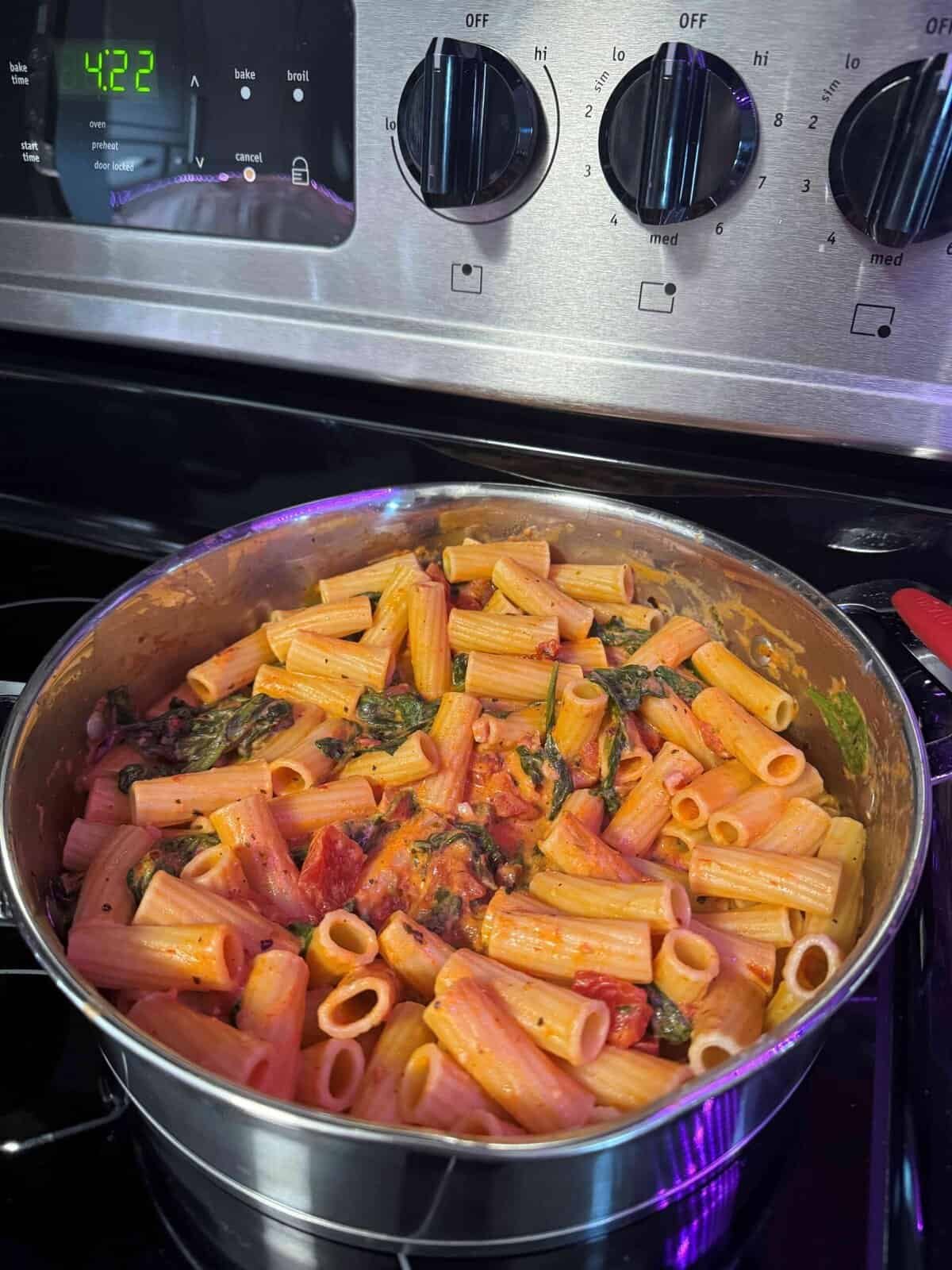- Some readers have also had success making this a one-pot pasta with spinach! To do this, they added the dry pasta with the tomatoes, seasonings, and water, but bumped the total amount of water up to about 2 cups total. Simmer until the pasta is cooked, adding more water if needed, then add the cream cheese, parm, and spinach!