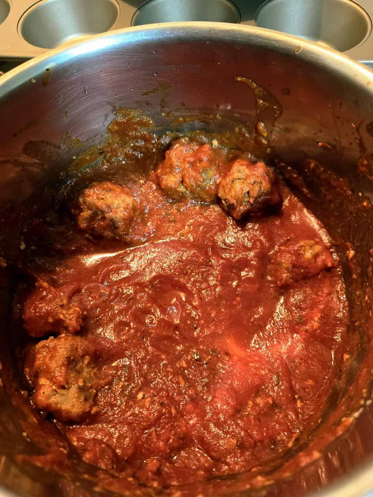 Transfer to red sauce (optional): Now transfer your cooked meatballs to the red sauce (either homemade or store-bought), and simmer for an additional 5 minutes. If not using a red sauce, bake for 3-5 minutes longer, or until cooked through.