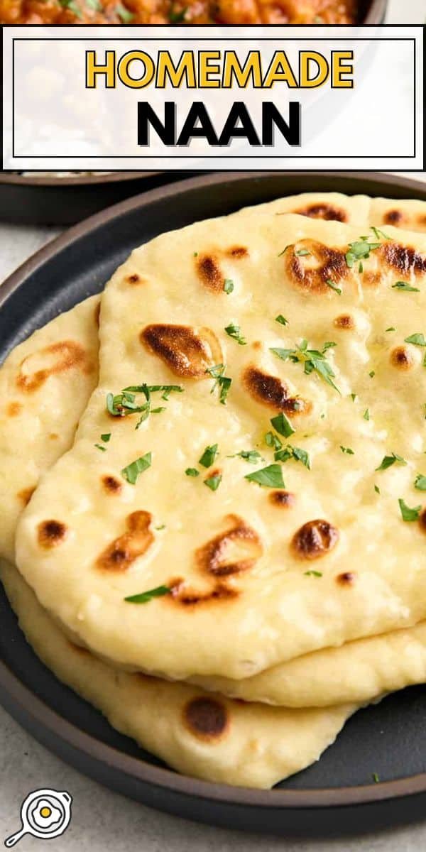 Naan is a traditional flatbread made in South and Central Asian countries. It is made with yogurt and egg, which makes it a little more tender and fluffy. It is traditionally cooked in a clay tandoor oven, which helps produce the bubbled texture.