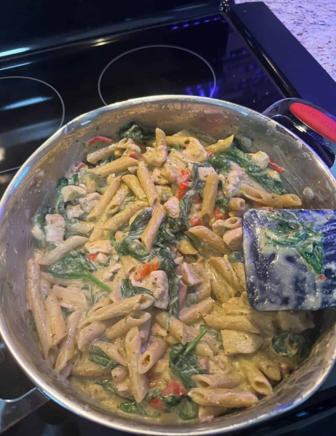 If you’re adding the 3 cups of fresh spinach and 1/4 cup sliced sun dried tomatoes, like I did, add them once the sauce is finished and stir just until the spinach has wilted, then remove the skillet from the heat.